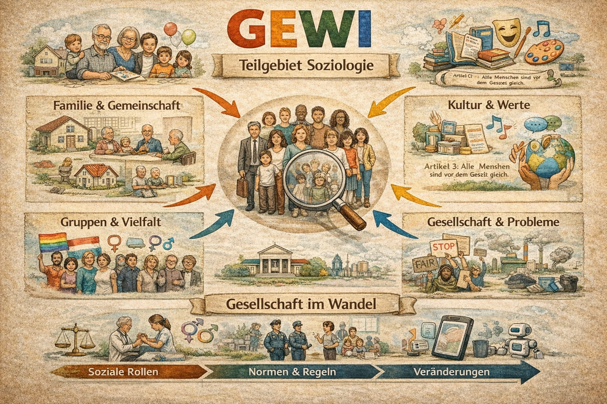 Soziologie ist quasi das Fach über Menschen und Gesellschaft. Also: Warum verhalten sich Menschen so, wie sie es tun? Welche Rollen haben wir in Familie, Schule oder Freundeskreis?